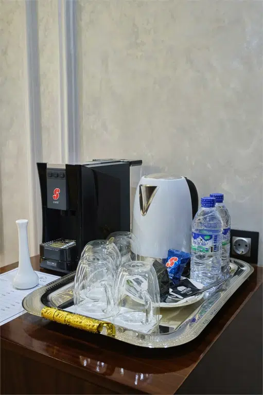 每个房间都有一个茶具,一个电水壶和两瓶水.
